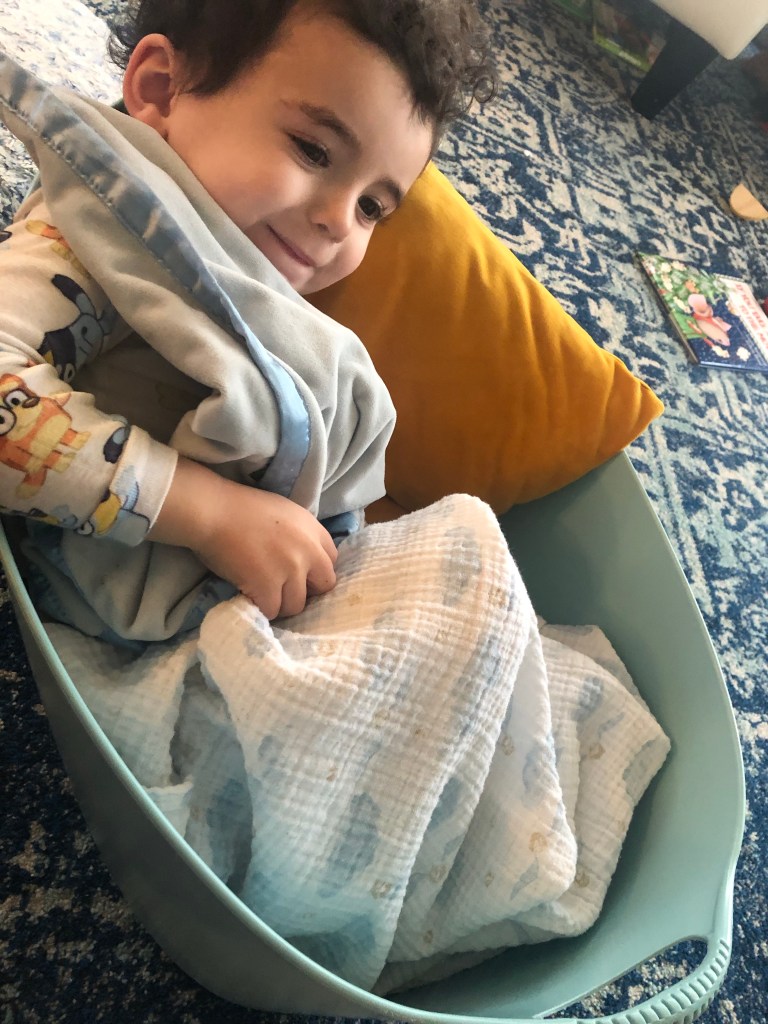 Like mother, like son. This kid loves to snuggle in laundry baskets, just like I did when I was little. It cracks me up and warms my heart all at once.